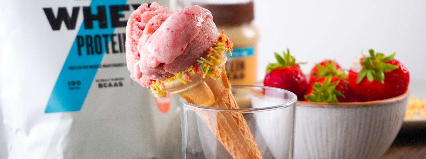 500g de banana congelada 500g de morangos congelados 50g de Impact Whey Protein (Creme de Morango) 120g de leite de coco light em lata