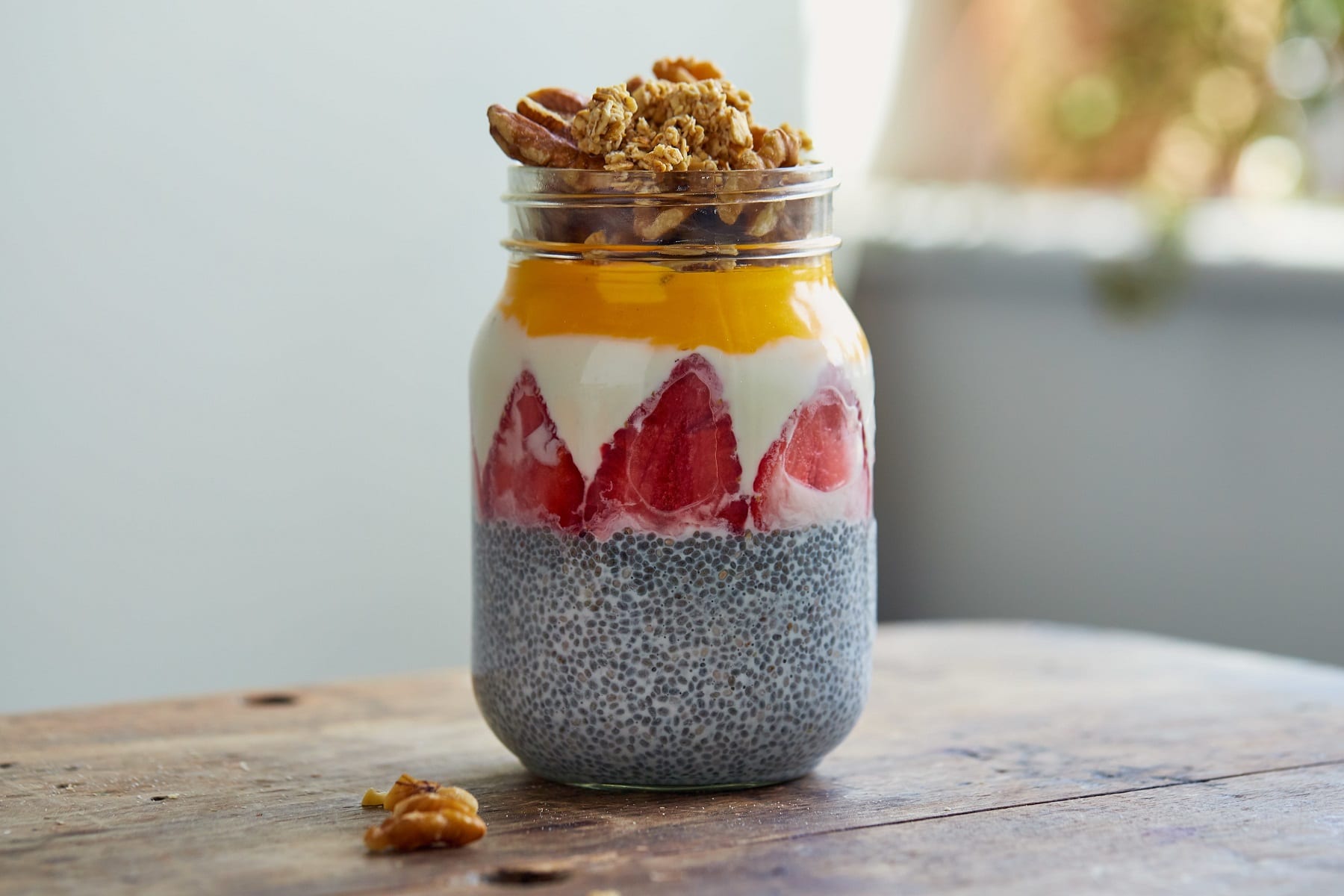 As sementes de chia têm uma série de benefícios de saúde. Antes de mais, são ricas em proteínas, e também em minerais como o manganês, para além de serem uma fonte de fósforo e de fibra. Experimenta esta fantástica receita de pudim de chia e armazena o pudim no frigorífico durante a noite, para lhe pegar antes de sair pela porta fora no dia seguinte.