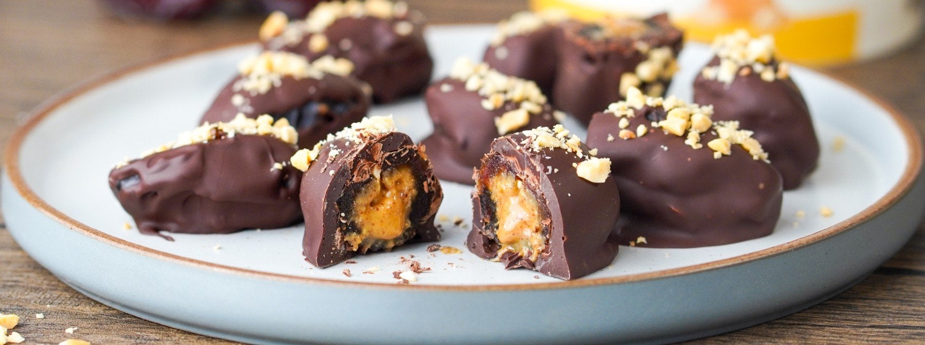 - Mistura a manteiga de amendoim com as tâmaras, fecha-as e acrescenta alguns amendoins triturados