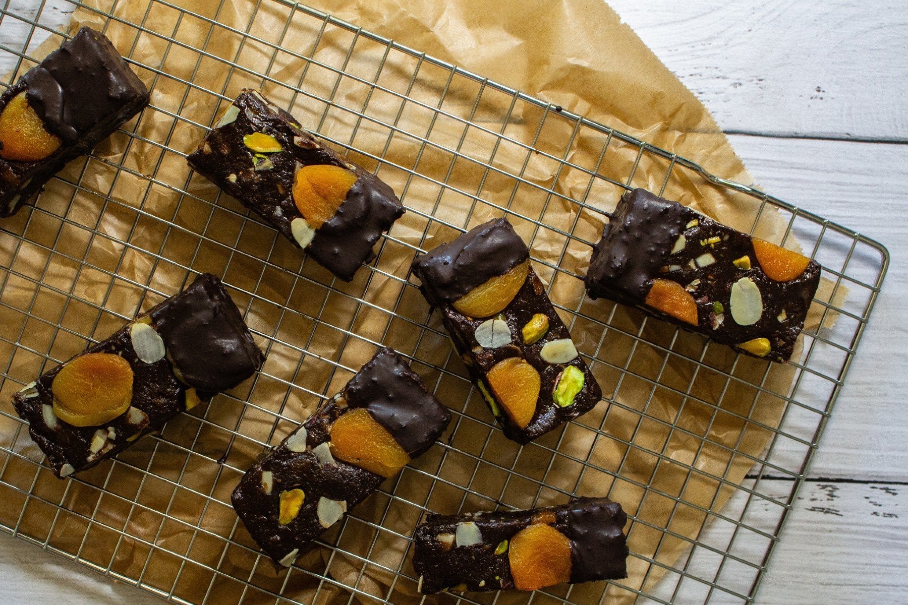- Corta a mistura em 8 barras de tamanho igual. Para um toque adicional, podes mergulhar cada uma em chocolate preto derretido. Deixa esfriar e bom proveito!