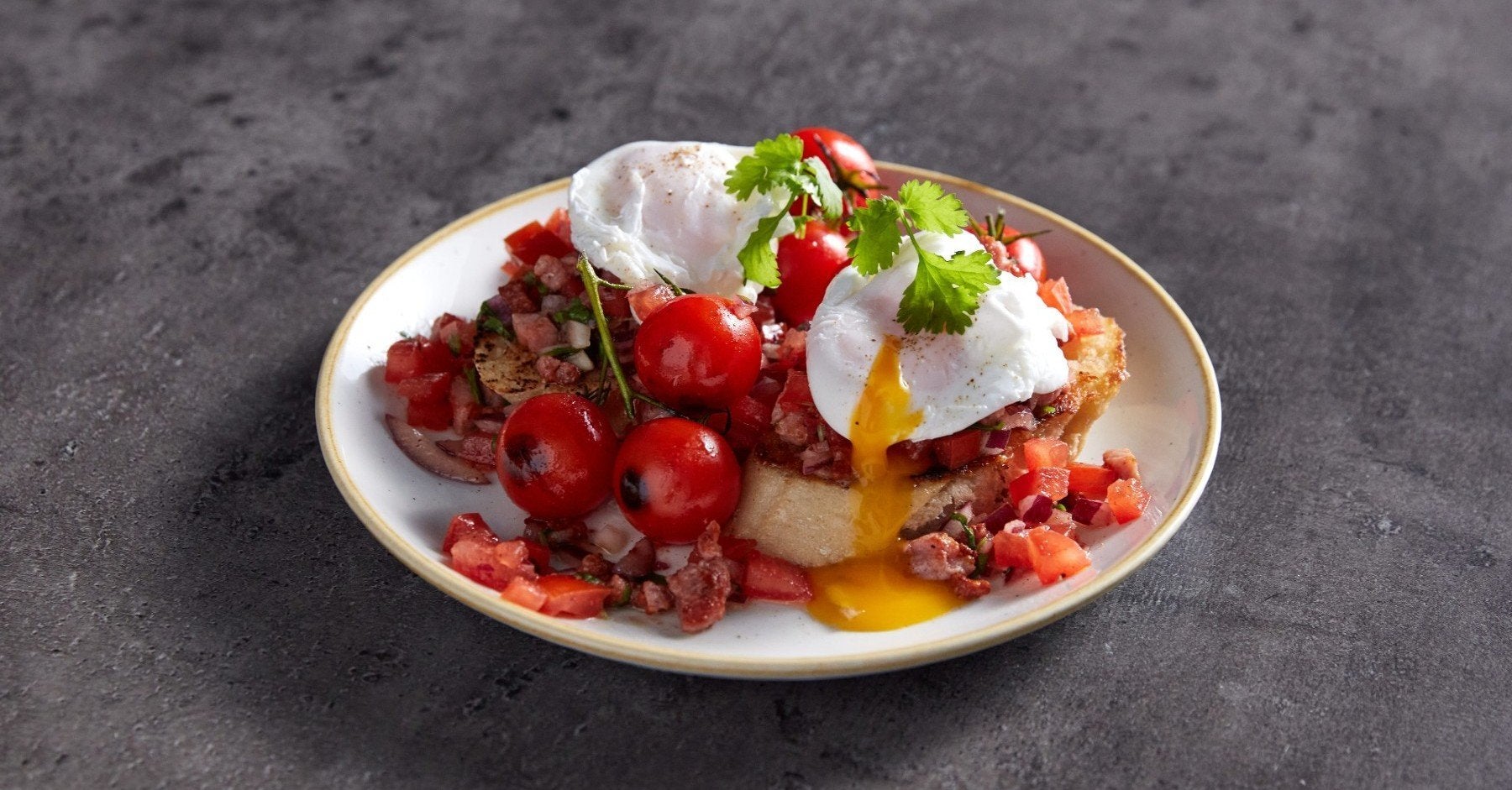 A bruschetta é um prato clássico italiano que é simples, delicioso e a estalar de sabores frescos. Propomos uma pequena variação, com o acrescento de saborosos pedaços de pancetta à tradicional cobertura de tomate e dois ovos escalfados para uma dose extra de proteína.