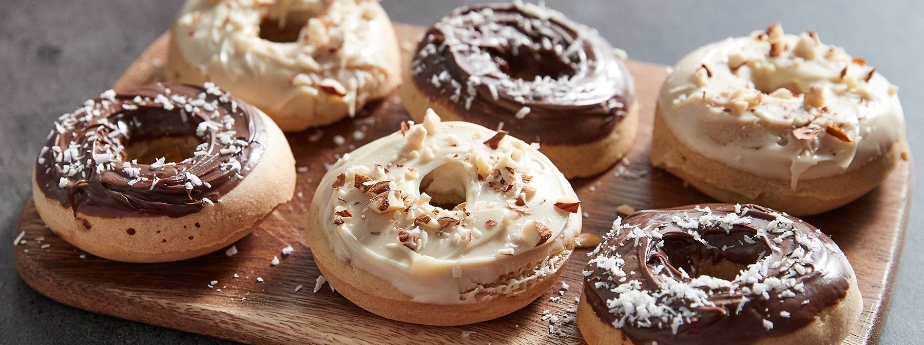 Estes donuts incríveis têm um aspeto e sabor iguais aos donuts convencionais – mas são feitos no forno em vez de fritos, o que elimina uma grande dose de gordura desnecessária. Para além disso, são feitos com adoçante natural, um pouco de xarope de ácer, em vez de estarem a abarrotar de açúcar refinado.