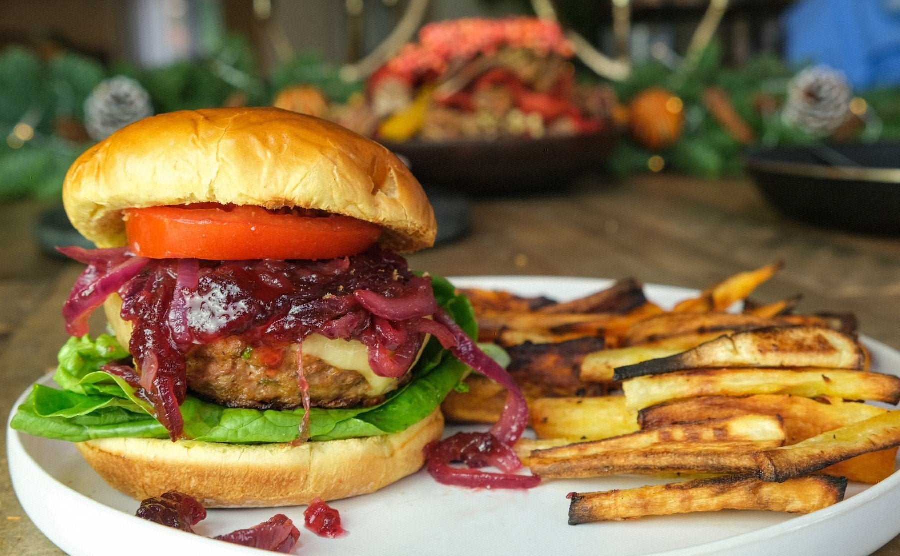 O peru com molho de arando é bem típico do Natal em alguns países. E este delicioso hambúrguer dedicado às festas é a forma perfeita de experimentar esta combinação. Usar picado magro de peru para fazer o nosso próprio hambúrguer é uma forma excelente de sabermos exatamente o que ele contém – e claro, isso também nos deixa temperá-lo ao nosso gosto.