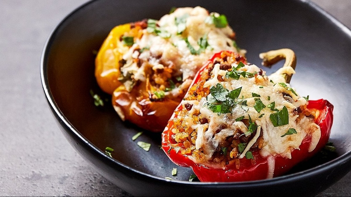 Esta receita fácil e rápida de pimentos recheados é a forma perfeita de obter uma boa dose de hidratos de carbono de baixo índice glicémico, já que estão cheios de triguilho, que é um grão integral com grandes quantidades de vitaminas, minerais e fibra. São também ricos em proteína graças ao saboroso recheio de carne – perfeito para te ajudar a atingir os teus requerimentos diários.