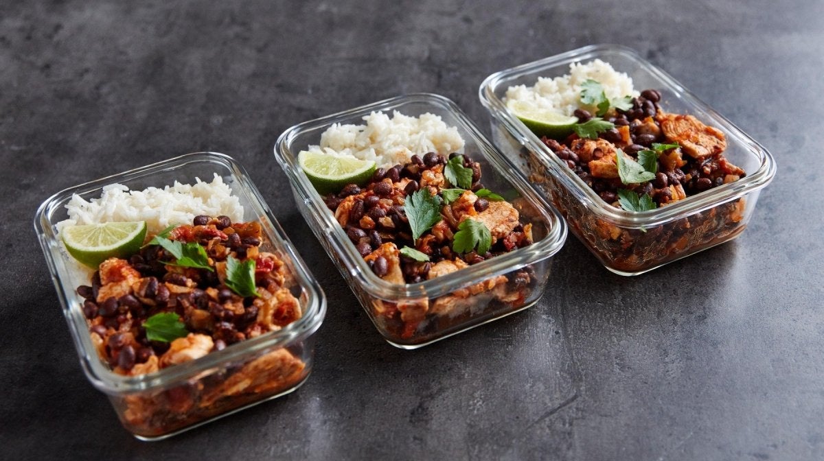 - Junta o feijão preto escorrido e o molho de salsa, mexendo para que tudo fique bem misturado. Deixa cozinhar por mais alguns minutos e reparte juntamente com o arroz cozinhado por recipientes para comida. Enfeita com coentros e uma fatia de lima.