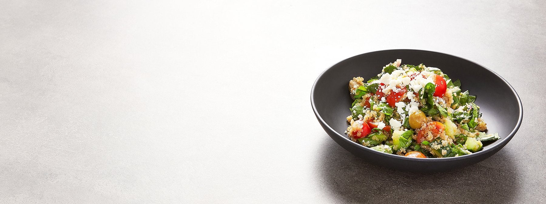 - Numa taça grande, mistura a quinoa cozinhada, espinafres, tomate-cereja, abacate, cebola roxa, pepino e azeitonas. Usa duas colheres de salada para mexer bem todos os ingredientes.