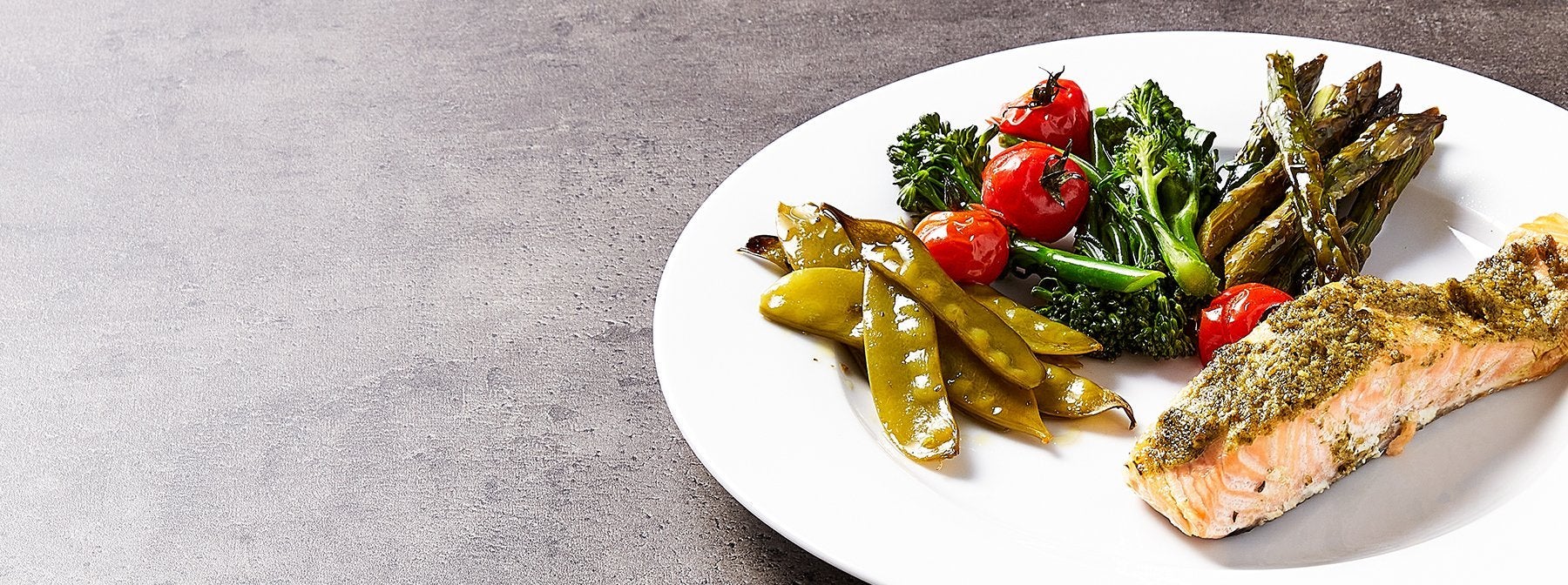 Na secção mais pequena do tabuleiro, coloca os quatro filetes de salmão e pinta cada um com uma colher de pesto. - Coloca todas as verduras e tomates na secção maior do tabuleiro, aspergindo-os depois com azeite, sal, pimenta e orégãos – certifica-te que todos ficam uniformemente cobertos.