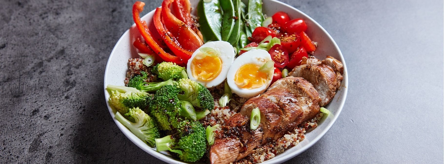 - Por fim, cria a taça proteica. Faz uma base de quinoa e adiciona os brócolos e a ervilha-torta, juntamente com fatias de pimento vermelho e tomate-cereja. Acrescenta o peito de frango e o ovo cozido (sem casca, claro!) e o resto da marinada que tinhas deixado de parte. Enfeita com cebola-primavera aos pedaços.