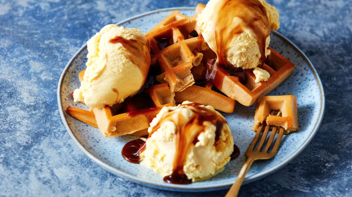 #4 Retira as waffles do molde, acompanha com gelado proteico e adiciona o xarope de chocolate. Prontissímo!